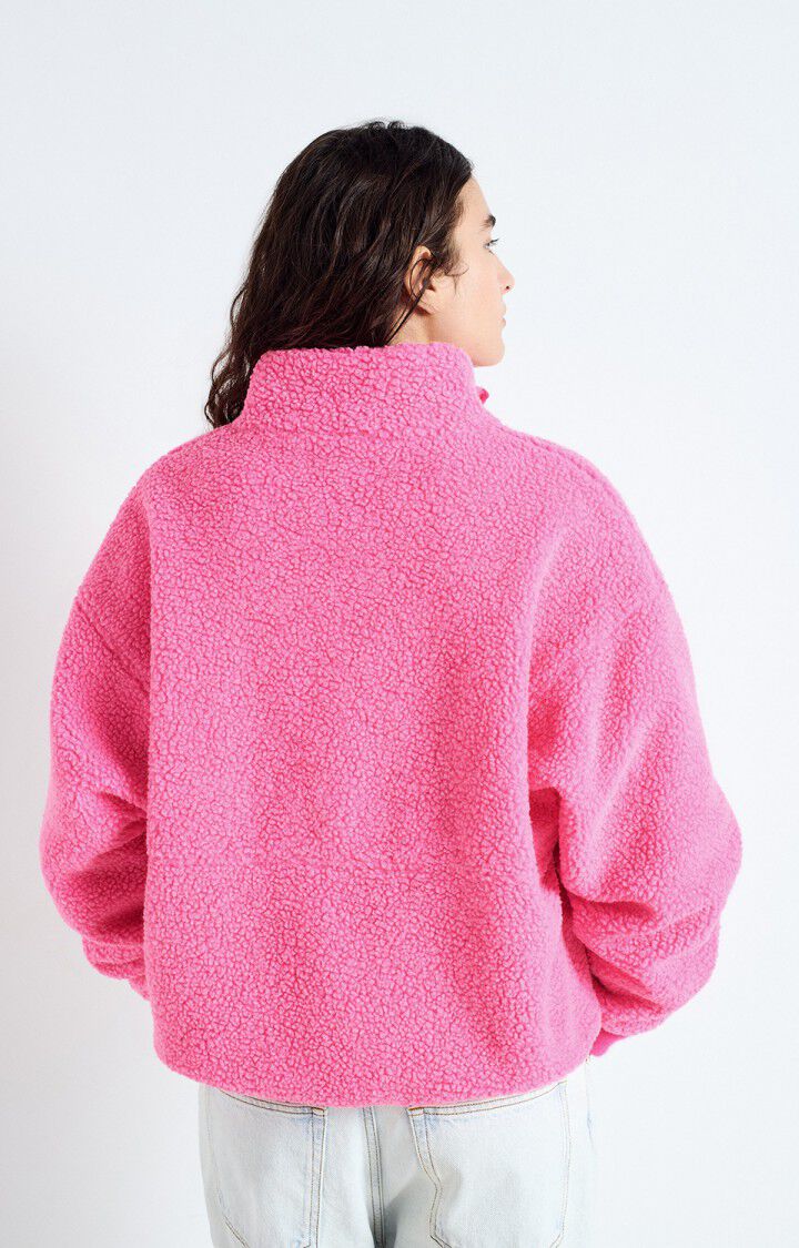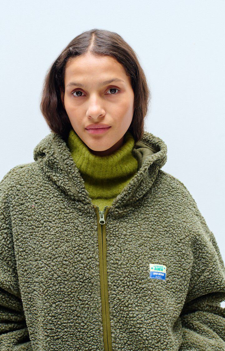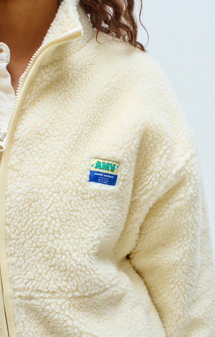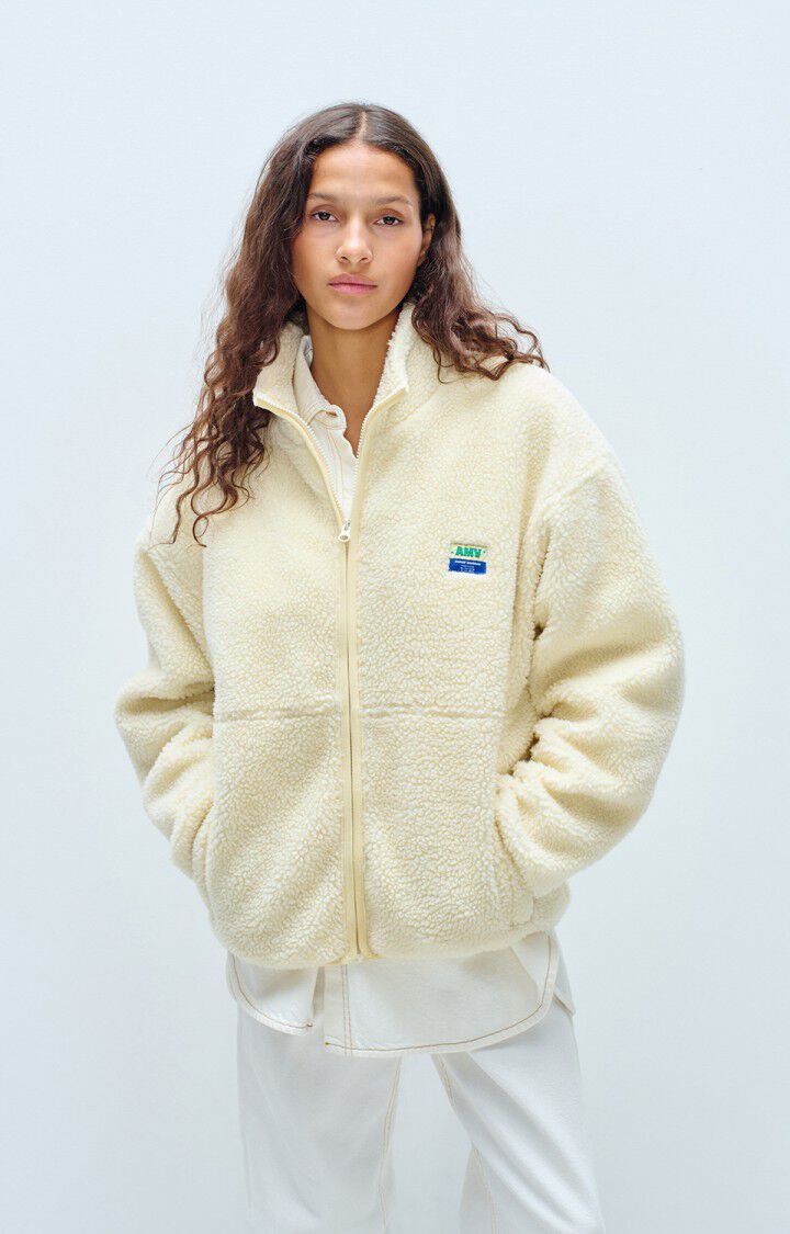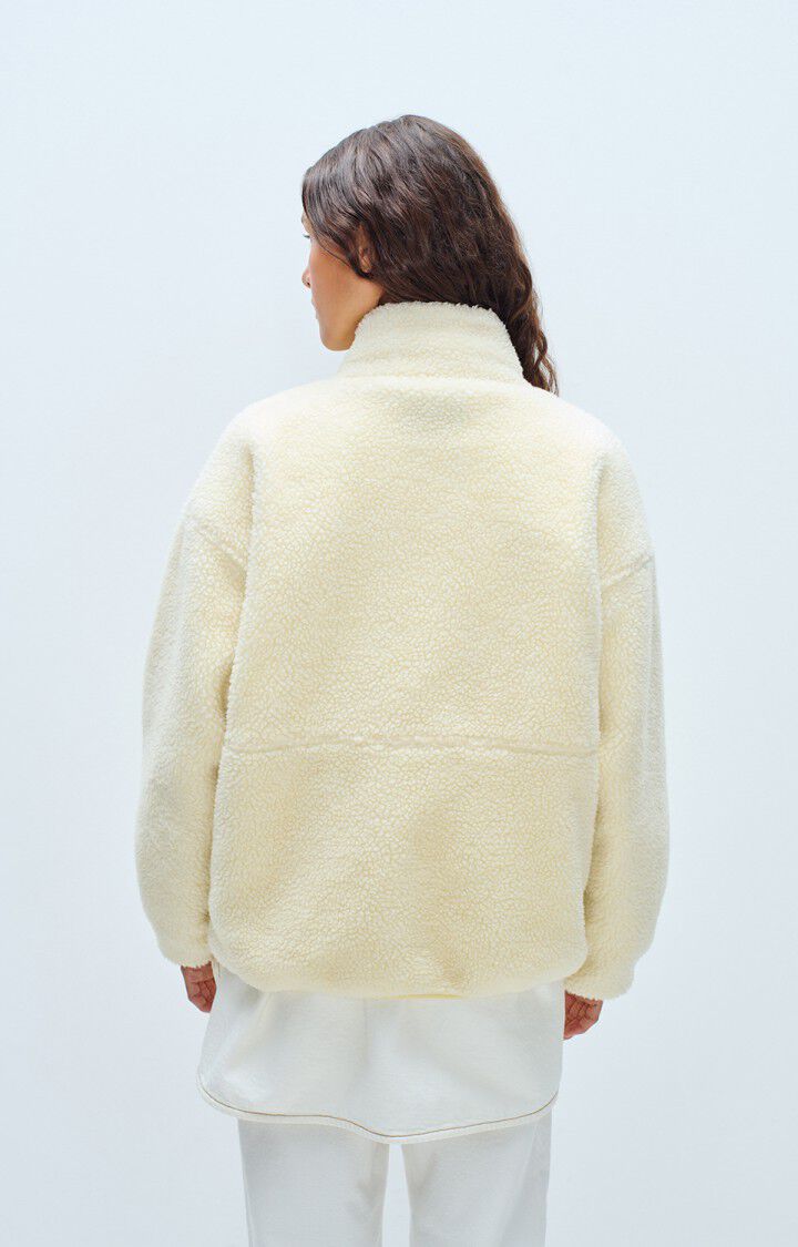 Veste polaire en sherpa écrue, douce et chaude, pensée pour affronter le froid avec confort. Son tissu bouclette épais assure une excellente isolation tout en restant léger et agréable à porter